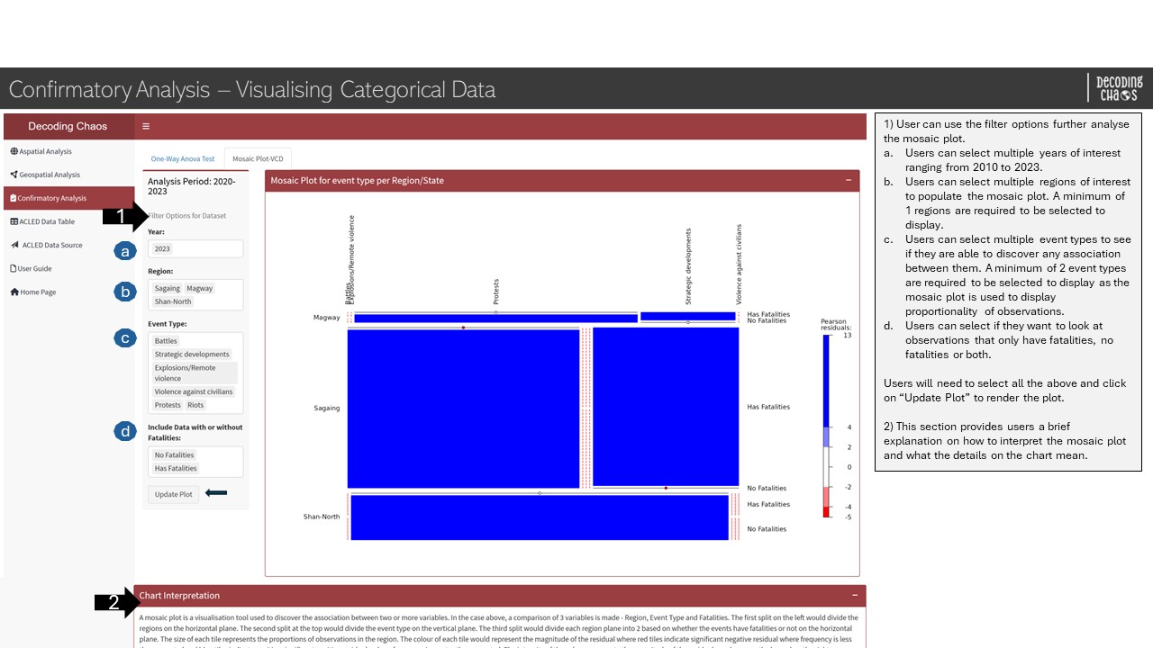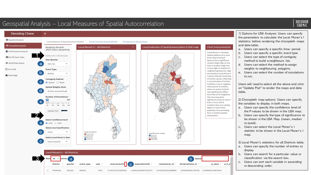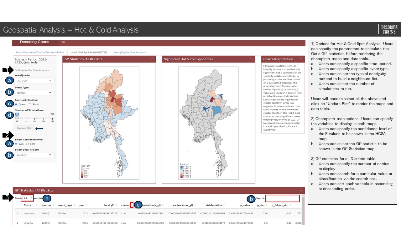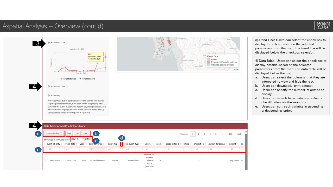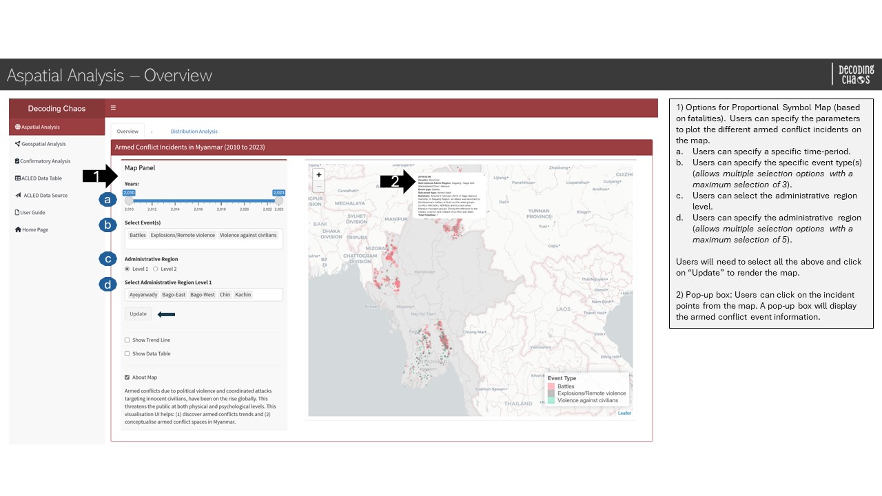 This tab serves as the “landing page” that displays the map of Myanmar and its spatial points of armed conflicts over the years (i.e. 2010 to 2023). Figure below shows the UI interactive features in the Overview sub-tab.